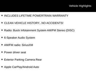 2-Way Manual Front Passenger Seat AdjusterApple CarPlay/Android AutoCLEAN VEHICLE HISTORY...NO ACCIDENTS!Emergency communication system: OnStar and Buick connected services capableFront License Plate BracketFront anti-roll barINCLUDES LIFETIME POWERTRAIN WARRANTYIlluminated entryOutside temperature displayPreferred Equipment Group 1SBRadio: 7" Diagonal Buick Infotainment SystemRadio: Buick Infotainment System AM/FM Stereo (DISC)Ride & Handling SuspensionRoof rack: rails only