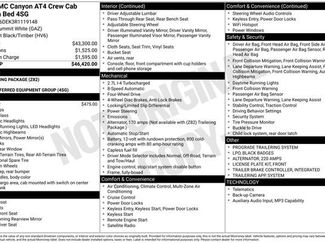 2 1st Row USB Charge/Data Ports2 Rear USB Ports in Center Console (Charge-Only)220 Amps Alternator4-Way Manual Front Passenger Seat AdjusterApple CarPlay/Android AutoAutomatic Emergency BrakingAutomatic Locking Rear DifferentialAutomatic Stop/StartBlack Badges (LPO)Canyon Pro SafetyCloth/CoreTec Seat TrimDriver Mode SelectorFollowing Distance IndicatorForward Collision AlertFront License Plate KitFront Pedestrian & Bicyclist BrakingFront anti-roll barIlluminated entryInterior Overhead Courtesy Light w/Dual Reading LampMultiStow TailgateOutside temperature displayPreferred Equipment Group 4SGProGrade Trailering SystemRadio: 11.3" Diagonal Premium GMC Infotainment SysRear of Console 120-Volt Power OutletStop/Start System Disable Button Engine ControlTailgate Keyed Cylinder LockTilt & Telescopic Manual Steering ColumnTrailering App SystemWheels: 18" x 8.5" Dark Gray Machined Finish AlumWireless Apple CarPlay/Wireless Android Auto