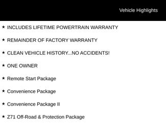 12.3" Multicolor Reconfigurable Digital Display170 Amp Alternator2 USB Data Ports220 Amp Alternator6" Rectangular Chrome Tubular Assist Steps (LPO)All-Star EditionApple CarPlay/Android AutoAuto-Locking Rear DifferentialAutomatic Emergency BrakingBluetoothï¾® For PhoneCLEAN VEHICLE HISTORY...NO ACCIDENTS!Chevrolet Connected Access CapableConvenience PackageConvenience Package IIDual Rear USB Ports (Charge Only)EZ Lift Power Lock & Release TailgateElectrical Steering Column LockElectronic Transmission Range Selector ShifterFollowing Distance IndicatorForward Collision AlertFront Frame-Mounted Black Recovery HooksFront Pedestrian BrakingFront anti-roll barHeated Driver & Front Outboard Passenger SeatsHeavy-Duty Air FilterHitch GuidanceHitch Guidance w/Hitch ViewINCLUDES LIFETIME POWERTRAIN WARRANTYIlluminated entryKeyless Open & StartMulti-Flex TailgateNot Equipped w/Steering Column LockONE OW>Off-Road SuspensionOutside temperature displayPreferred Equipment Group 1LTPremium audio system: Chevrolet Infotainment 3 PremiumProtection PackageREMAINDER OF FACTORY WARRANTYRadio: Chevrolet Infotainment 3 Premium SystemRear Wheelhouse LinersTrailering App