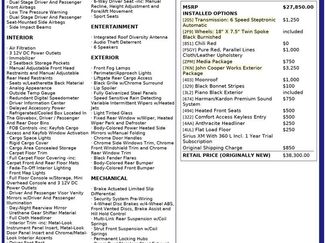 Badge DeletionBlack Bonnet StripesBluetoothï¾® and USB/iPod AdapterComfort Access Keyless EntryEnhanced Bluetooth & USB/iPod AdapterFront anti-roll barIlluminated entryJohn Cooper Works Aerodynamic KitJohn Cooper Works Exterior PackageMINI 6.5" Visual Boost ScreenMINI Connected (6NM)MINI Wired PackageMedia PackageOutside temperature displayRear anti-roll barRoof rack: rails onlySatellite Radio w/1 Year SubscriptionSport SeatsStandard SuspensionWheels: 17" x 7.0" 5-Star Triangle Spoke SilverWheels: 18" x 7.5" Twin Spoke Black Burnishedharman/kardonï¾® Logic 7ï¾® Digital Surround