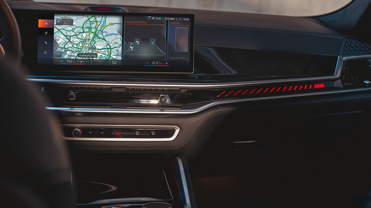 Upgrades to the M60i cabin include heated and ventilated multi-contour front seats, a head-up display, and a 16-speaker Harman Kardon audio system.